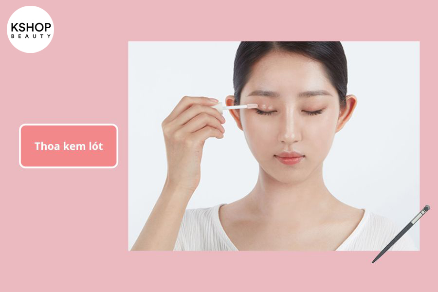 Bước 2: Thoa kem lót để làm đều bầu mắt, che đi những khuyết điểm và giúp phấn mắt bám màu tốt hơn.