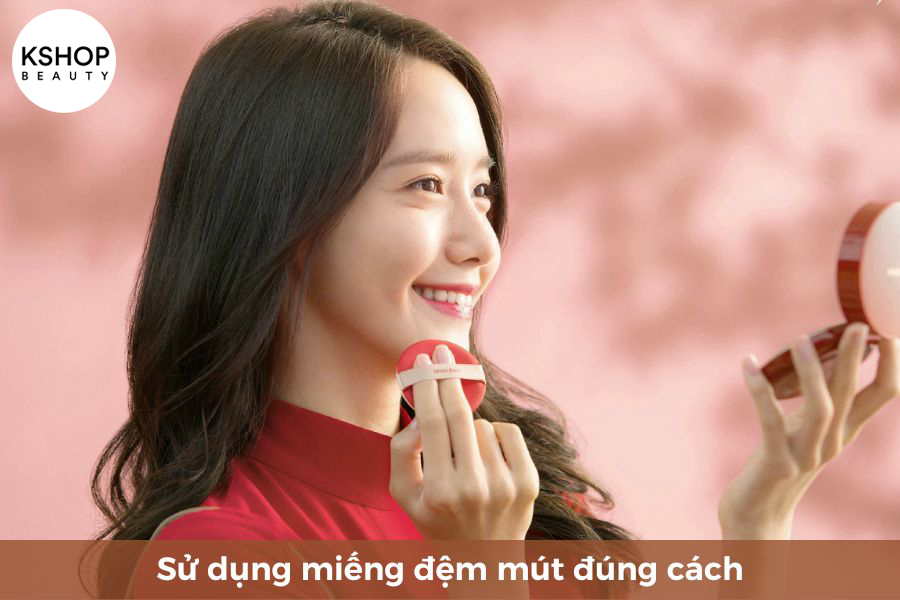 Việc dùng đệm mút lấy kem lên tưởng chừng như đơn giản nhưng lại có nhiều bạn thao tác sai cách, khiến cho lớp trang điểm bị dày cộm, không mịn màng và sẽ làm bí da. Để sử dụng đúng cách, bạn thực hiện như sau: ấn và giữ miếng mút trong khoảng 3-5 giây cho phấn thấm đều vào mút rồi mới apply lên da. Trong quá trình tán nền, bạn chỉ nên chạm và vỗ nhẹ nhàng chứ không nên chà xát quá mạnh vì nó sẽ để lại vệt trên da.