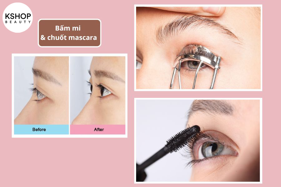 Bước 5: Bấm mi và chuốt mascara để tạo hiệu ứng mi cong vút.