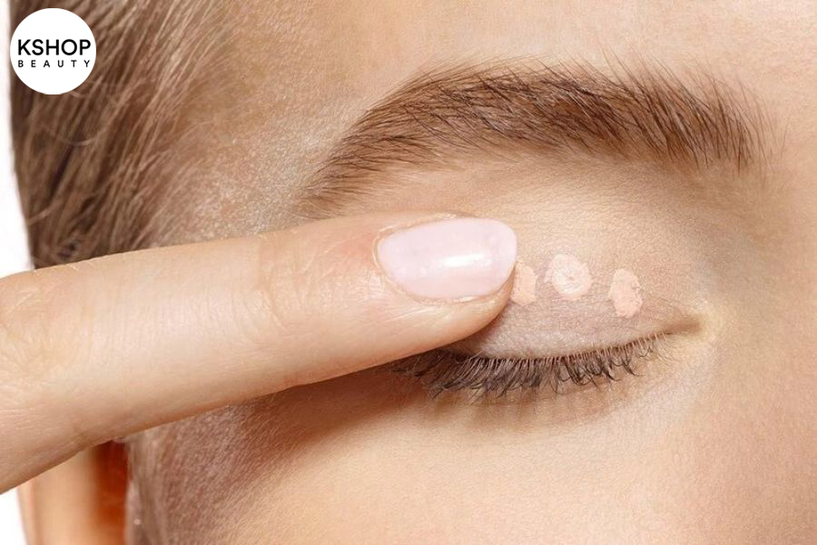Bước 3: Tán kem nền cho mắt để giúp phấn mắt bám lâu hơn và tệp nhanh vào mắt. Ngoài ra còn giúp che đi những quầng thâm mắt do thức khuya.
