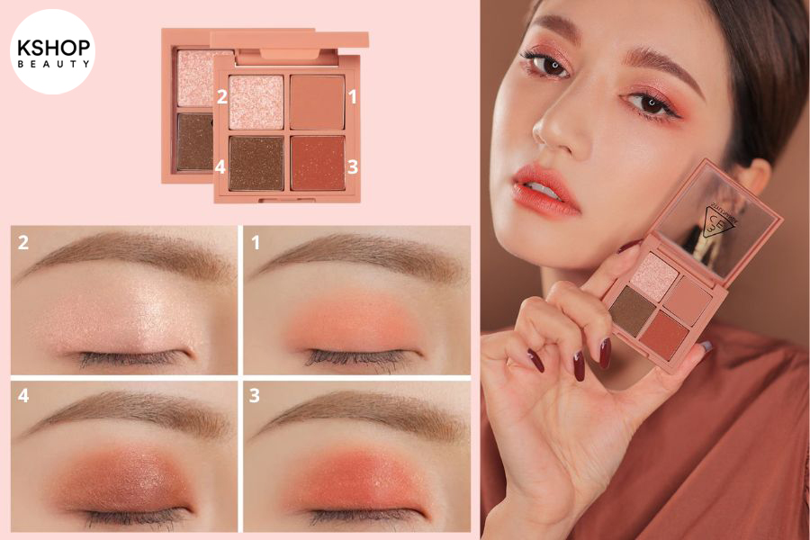 - Chọn bảng mắt phù hợp có tone màu Hàn Quốc mà bạn yêu thích, ví dụ như cam đất, cam đào, hồng đào…KSHOPBEAUTY sẽ chọn bảng phấn mắt đình đám đến từ thương hiệu mỹ phẩm 3CE nổi tiếng của Hàn Quốc.
