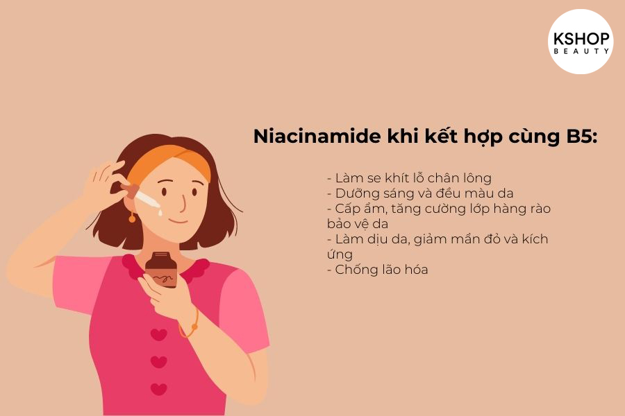 Niacinamide hoàn toàn có thể kết hợp cùng vitamin B5 và cho ra bộ đôi chăm sóc da cực kì hiệu quả. Các lợi ích tiêu biểu trên da mà Niacinamide và B5 có thể tạo ra: