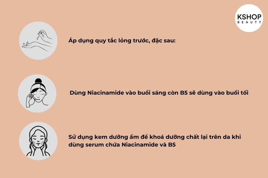 – Nếu sử dụng serum có chứa cùng lúc Niacinamide và B5 thì bạn nhất định phải sử dụng cả kem dưỡng ẩm để khoá dưỡng chất lại trên da.