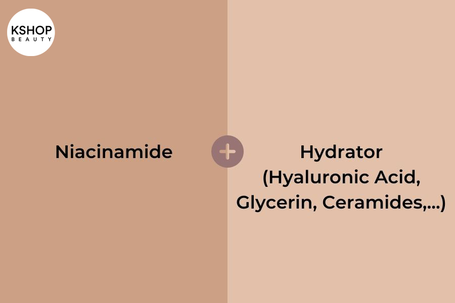 Niacinamide khi kết hợp cùng các thành phần có khả năng dưỡng ẩm Hydrator như Hyaluronic Acid, Glycerin, Ceramide,… sẽ có khả năng giúp da phục hồi nhanh chóng, cải thiện những tổn thương trên da sau mụn, sau sử dụng các sản phẩm không phù hợp với da,… Khi dùng Niacinamide và Hydrator, bạn nên xem kết cấu của các thành phần này như thế nào để có thể sử dụng đúng cách. Ví dụ: Niacinamide và Hyaluronic Acid đều có độ pH trung tính, vì vậy, cần phải dựa vào độ sánh của sản phẩm để sử dụng; Ceramides có dạng dầu nên bạn sử dụng Niacinamide trước, Ceramides sau.