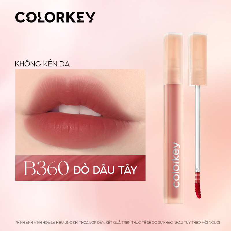 Son Kem Lì Colorkey Soft Matte Water Tint là lựa chọn lý tưởng cho những cô nàng yêu thích vẻ đẹp nhẹ nhàng, tự nhiên nhưng vẫn nổi bật. Với công nghệ đột phá Watery Matte, chất son khi vừa thoa lên môi sẽ tạo hiệu ứng căng bóng mỏng nhẹ, sau đó dần tiệp vào da môi, mang lại lớp finish mờ lì mềm mại, không gây khô hay nặng môi.