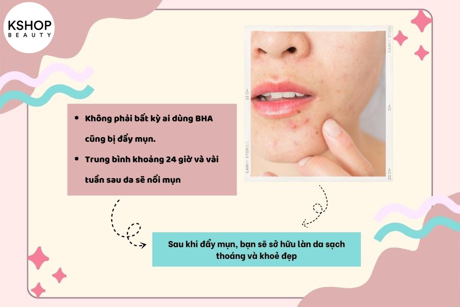 Da bị đẩy mụn thường sẽ xuất hiện sau khoảng 2-3 ngày sử dụng BHA, bạn sẽ thấy da nhiều mụn ẩn, mụn đầu đen và không bị ngứa ngáy khó chịu. Do vậy bạn yên tâm sử dụng sản phẩm, khi mụn được đẩy lên hết da mặt sẽ sạch thoáng và mịn màng hơn.